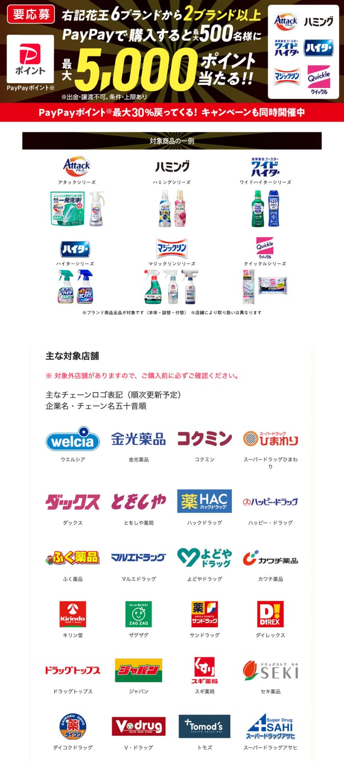 - 1.0.15 対象店舗限定 対象花王6ブランドから2ブランド以上PayPayで購入すると最大5,000ポイント当たる‼︎