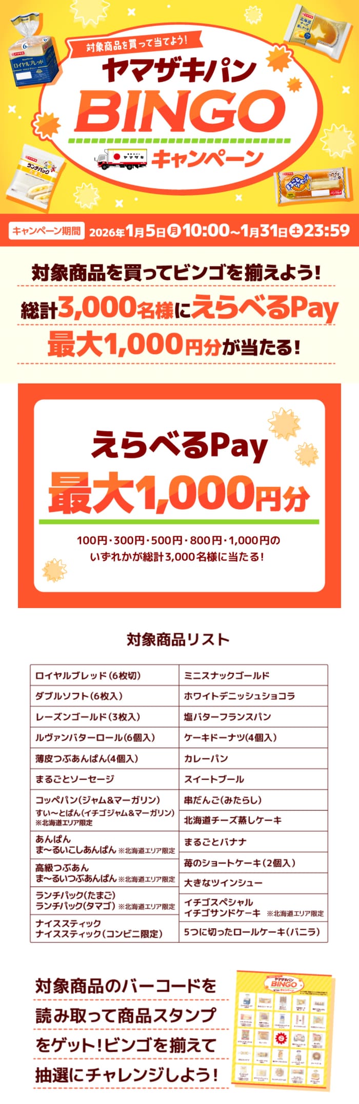 対象商品のバーコードを読み取りビンゴを揃えて応募。