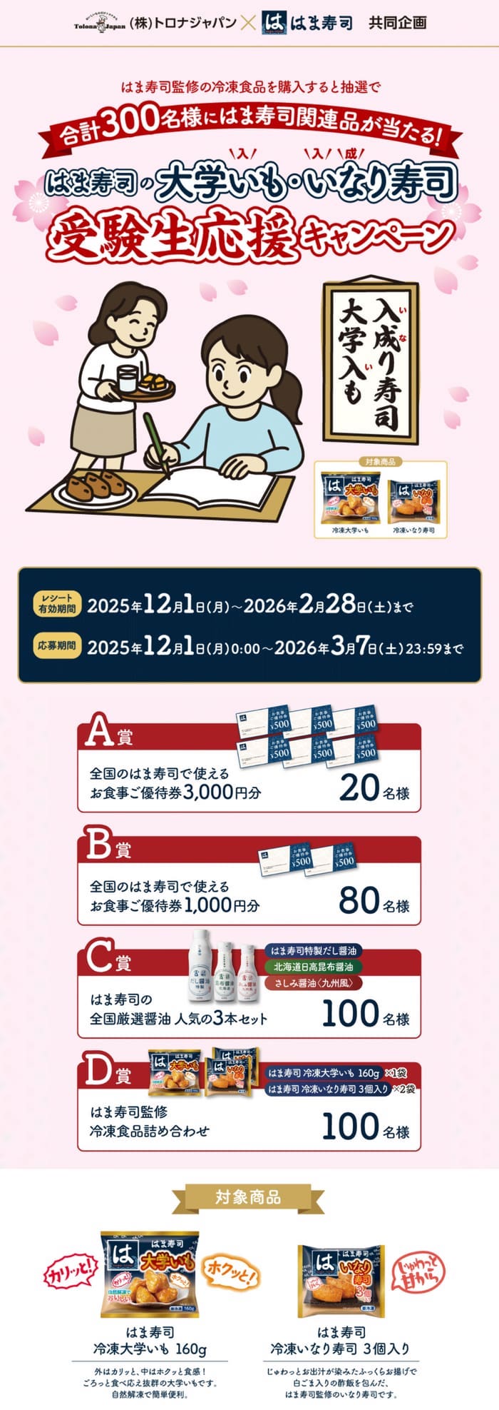 D賞:はま寿司の冷凍食品詰め合わせ(はま寿司 冷凍大学いも 160g×1袋・はま寿司 冷凍いなり寿司 3個入り×2袋)…100名